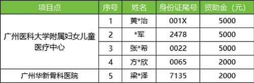 6月21日,廣州尚賢慈善基金會發(fā)布兩條公示信息,一條是廣州市婦兒兒童醫(yī)療中心(第七批)、廣州華新骨科醫(yī)院(第十批次)擬資助名單中共有5名兒童獲得“慢慢成長星計劃”專項基金支持?,F(xiàn)對正式資助名單進行公示: