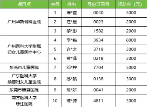 另一條信息是廣州市婦女兒童醫(yī)療中心(第八批次)、南方醫(yī)科大學珠江醫(yī)院(第六批次)、廣州華新骨科醫(yī)院(第十一批次)、廣東醫(yī)科大學順德婦女兒童醫(yī)療中心(第六批次)、東莞市兒童醫(yī)院(第九批次)、東莞市康復醫(yī)院(第四批次)擬資助名單中共有10名兒童獲得“慢慢成長星計劃”專項基金支持,現(xiàn)對正式資助名單進行公示: