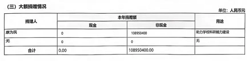 哈爾濱工業(yè)大學教育發(fā)展基金會2024年度工作報告截圖記者查詢哈爾濱工業(yè)大學教育發(fā)展基金會2024年度工作報告發(fā)現(xiàn),2024年度基金會收到捐贈人康為民的非現(xiàn)金捐贈,合計金額為108950400元,捐贈用途為“助力學??蒲心芰ㄔO”。