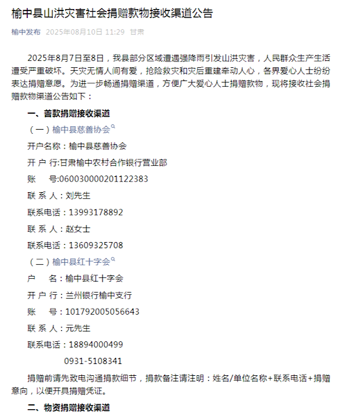 榆中縣山洪災(zāi)害社會(huì)捐贈(zèng)款物接收渠道公告