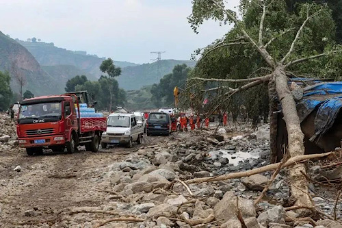 8月9日,在榆中縣馬坡鄉(xiāng)馬蓮灘村,救災(zāi)車(chē)輛行駛在路上。新華社記者 郎兵兵 攝