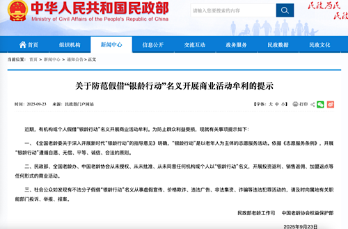民政部發(fā)布防范假借“銀齡行動(dòng)”名義牟利的提示