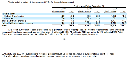 “通過醫(yī)療眾籌、互助平臺和保險市場,我們構(gòu)建了一個龐大的社會保障和支持網(wǎng)絡(luò),提高了人們的保險意識。”水滴公司在招股書中介紹,“我們的醫(yī)療眾籌業(yè)務(wù)將大量流量引向我們的保險市場。2018年、2019年和2020年實現(xiàn)的FYP(first year premium,首年保費)約46.5%、23.0%和13.0%來自水滴的醫(yī)療眾籌平臺。”