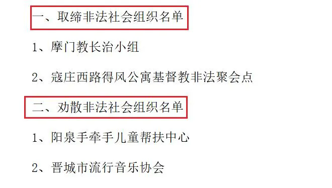 據(jù)山西省民政廳10月14日消息,山西省民政廳日前公布了一批依法取締和勸散的非法社會(huì)組織名單,其中取締兩家,包括摩門教長(zhǎng)治小組、寇莊西路得風(fēng)公寓基督教非法聚會(huì)點(diǎn);勸散兩家,包括陽泉手牽手兒童幫扶中心、晉城市流行音樂協(xié)會(huì)。
