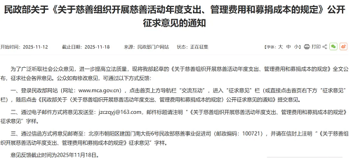 11月12日,民政部官網(wǎng)發(fā)布《關(guān)于慈善組織開展慈善活動(dòng)年度支出、管理費(fèi)用和募捐成本的規(guī)定》(以下簡稱《規(guī)定》),并公開征求社會(huì)各界意見。意見反饋截止時(shí)間為2025年11月18日。